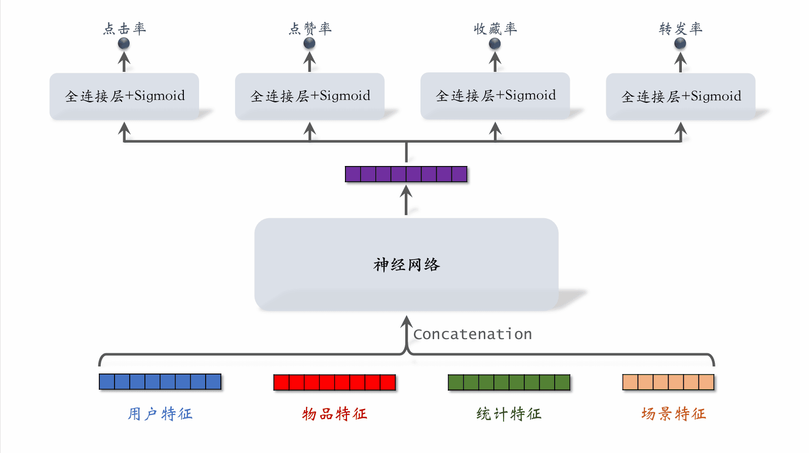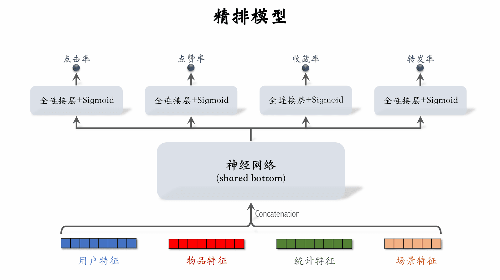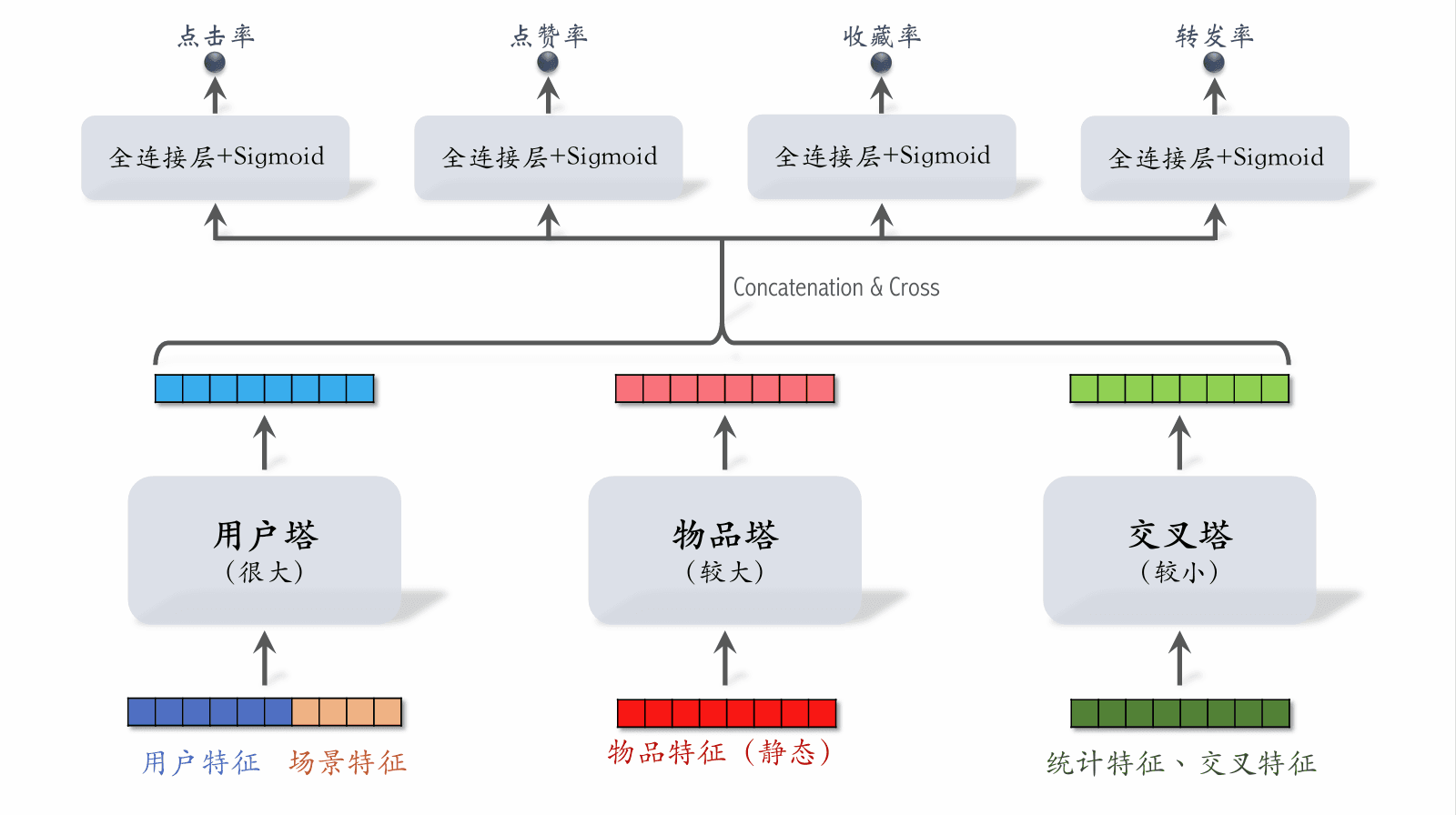 - 排序模型预估点击率、点赞率、收藏率、转发率等多种分数。