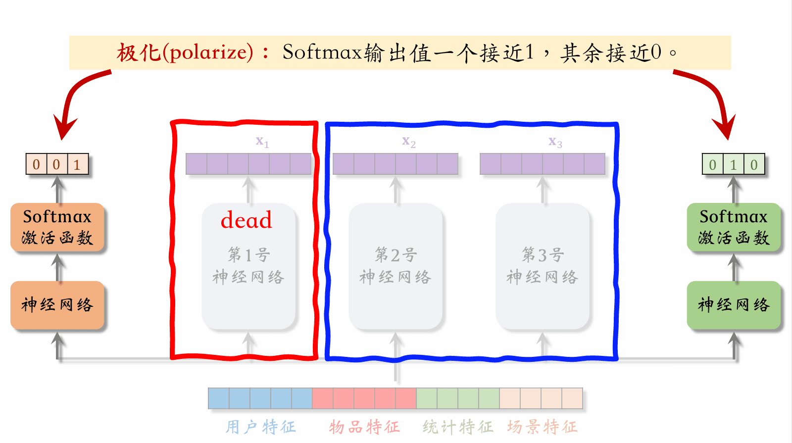 当左侧门控神经网络输出向量中 3 号专家神经网络的权重接近 1,其余接近 0。右侧门控神经网络输出向量中 2 号专家神经网络的权重接近 1,其余接近 0。这样加权过后就会导致 1 号神经网络的输出向量没有参与模型工作。应该尽量避免这种情况。